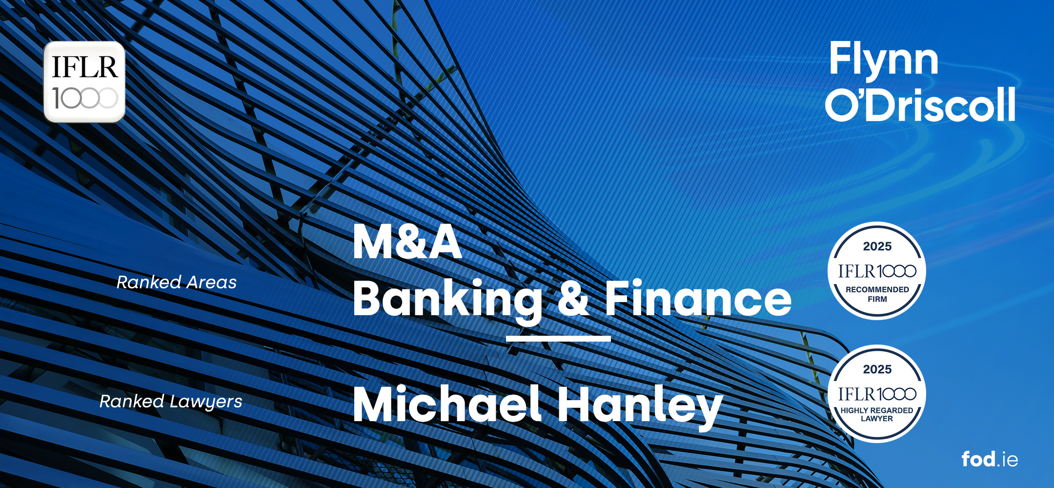 Flynn O’Driscoll is delighted to announce that we have been recognised as a “Recommended Firm” for Banking and Finance and M&A in the IFLR1000 rankings. The firm also features in the Notable category in Asset Finance. Partner Michael Hanley retains his ranking as “Highly Regarded Lawyer”.