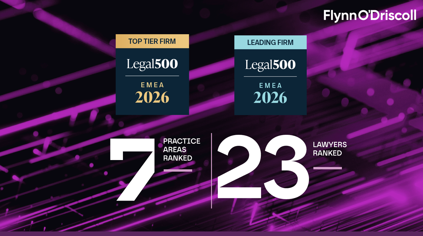 Flynn O'Driscoll has been recognised once again as a “Top Tier Firm” for Media & Entertainment in the Legal 500 EMEA 2026 Guide. The firm also ranked in 6 practice areas as a “Leading Firm” in Banking & Finance, Corporate, Commercial and M&A, Dispute Resolution, Employment, Intellectual Property and Real Estate.